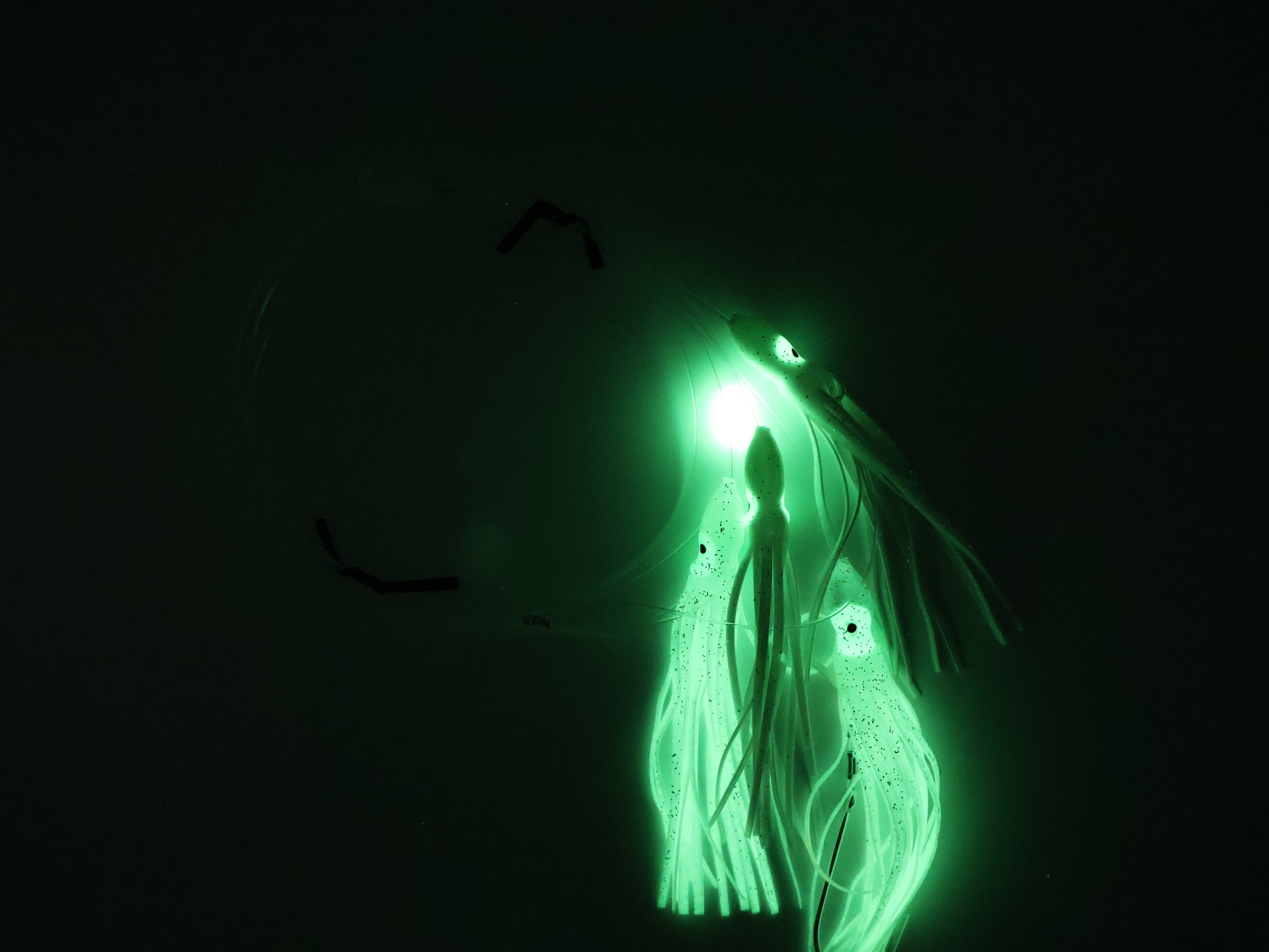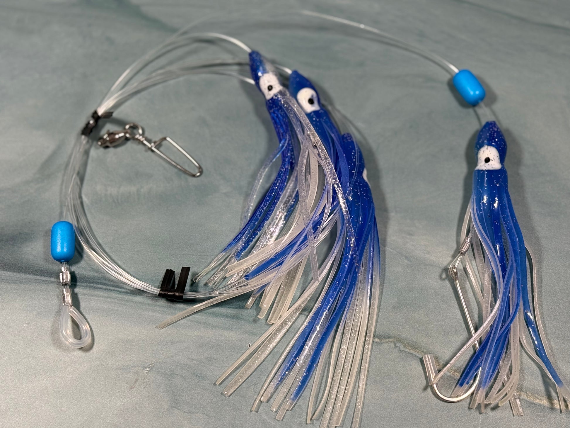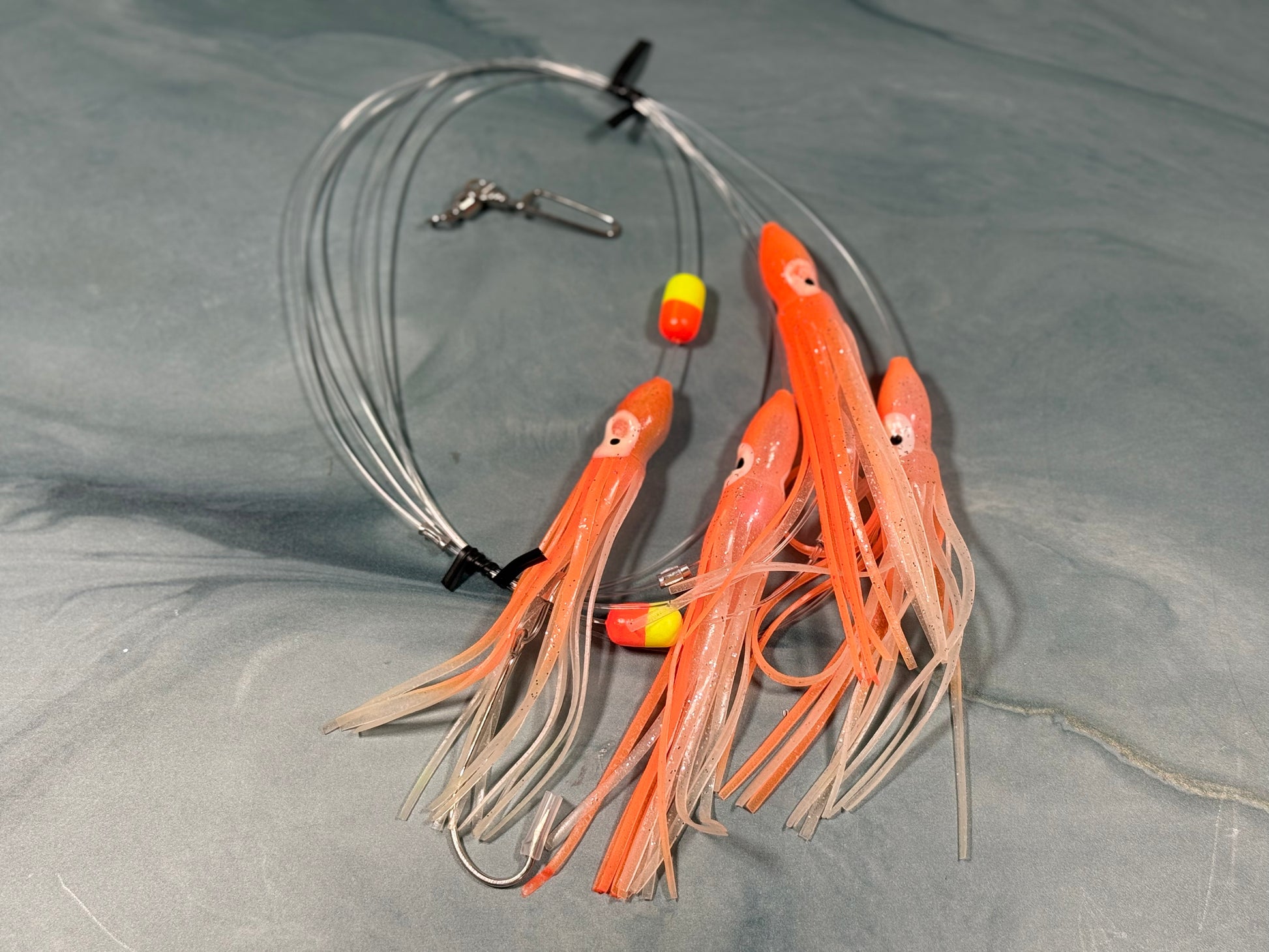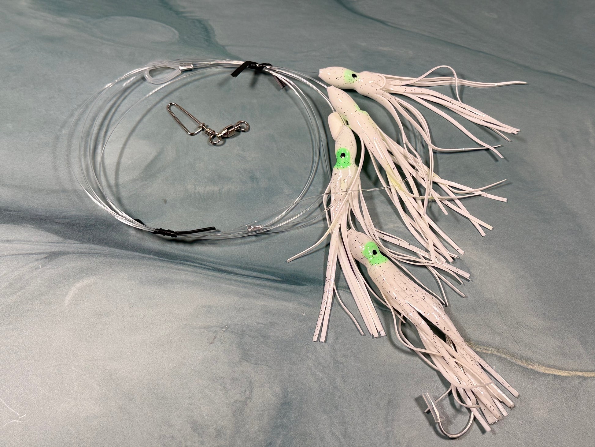Each Daisy Chain comes rigged with 100lb Mono and is equipped with 4 plastic squid (each measuring about 4.75 inches), and the trailing squid is fixed with a 6/0 hook