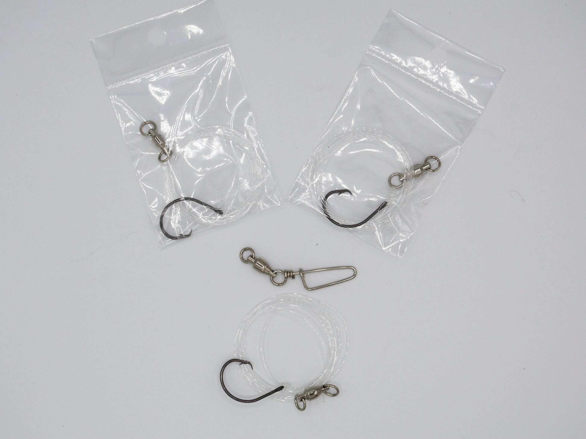 This rig is hand tied and equipped with a stainless swivel. Also come with a bonus snap swivel you can attach to your main line for quick attaching and removing.