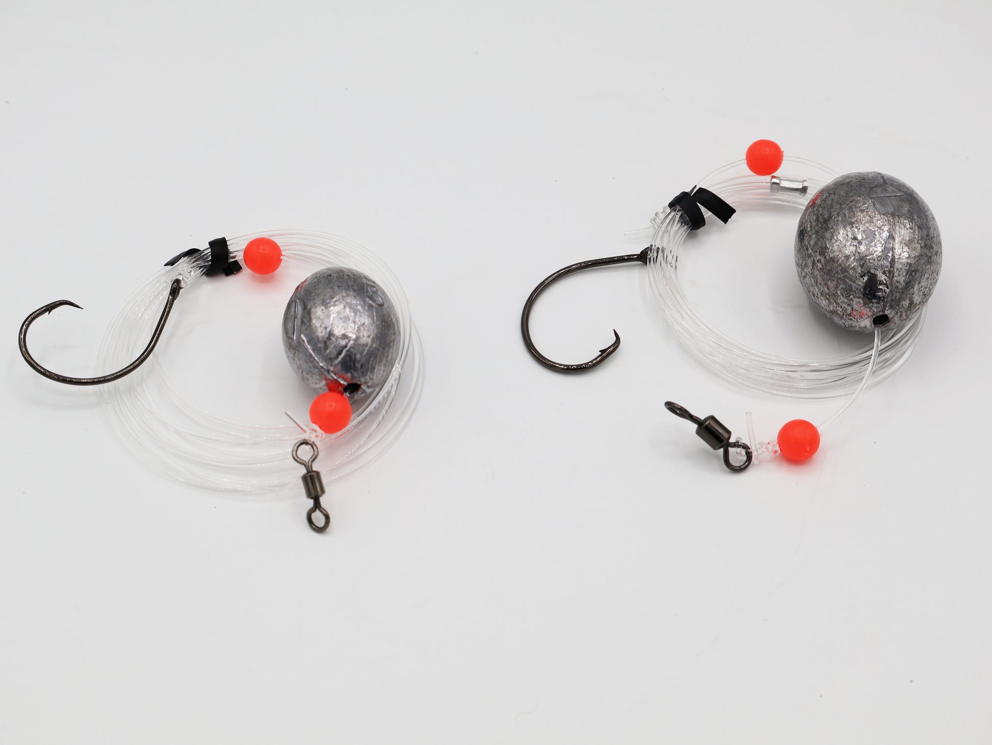 Sizes are 3oz weight with 80# Mono with a 6/0 Circle Hook, or 6oz weight with 100# Mono with a 7/0 Circle Hook.