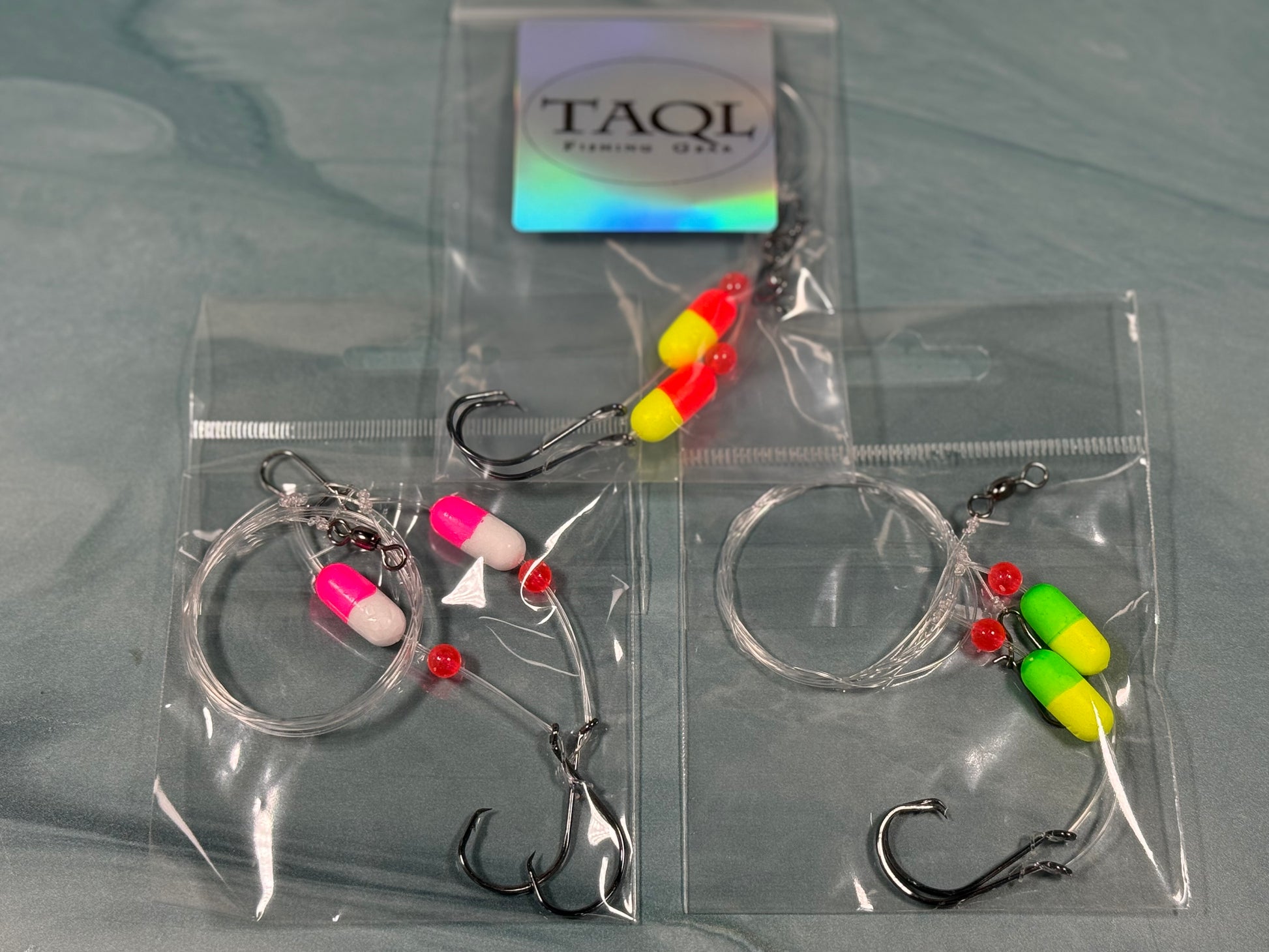 These pompano rigs come equipped with 2 Circle hooks (size 2/0) and 2 floats to double your hook up rate. Floats available in the attractive colors of Yellow/Green, Orange/Yellow, and Pink/White. There is also red plastic bead to help act as an attractant if you start jigging this rig.